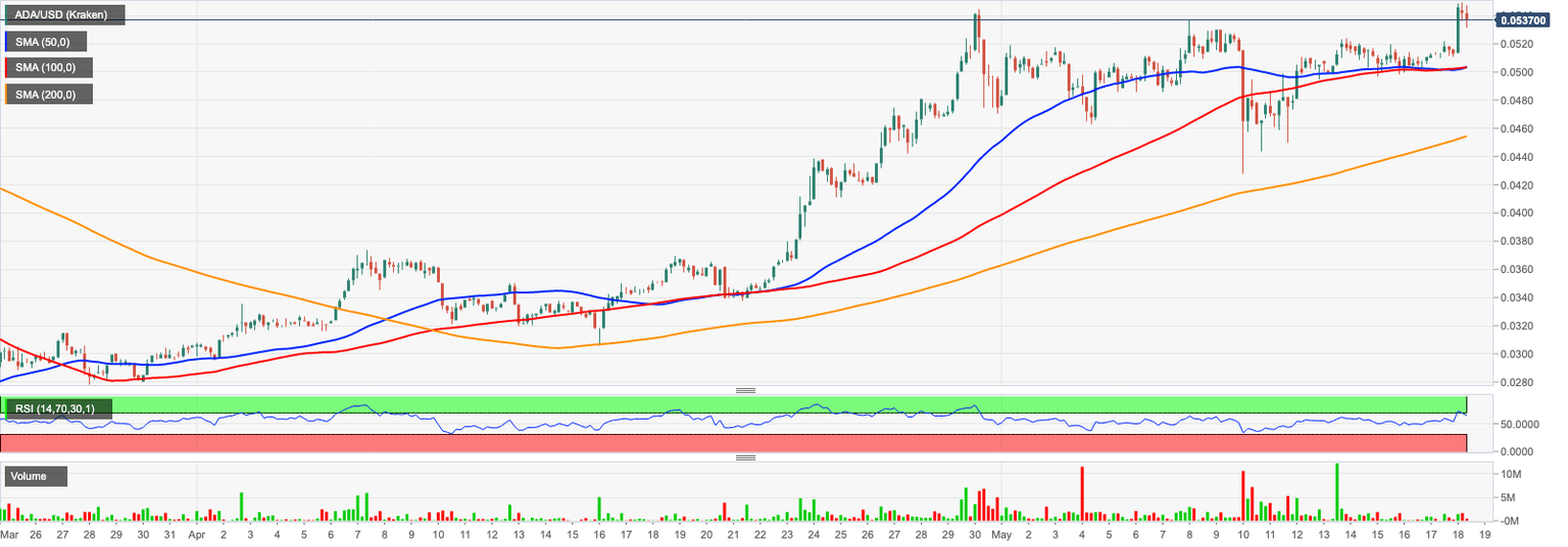 Cardano (ADA) hit the intraday high of $0.0548 during early Asian hours and retreated to $0.0537 by press time. Despite the sell-off, the coin is still nearly 6% higher from this time on Sunday. It takes the 12th place in the global cryptocurrency rating with the current market capitalization of $1.4 billion and an average daily trading volume of $154 million.