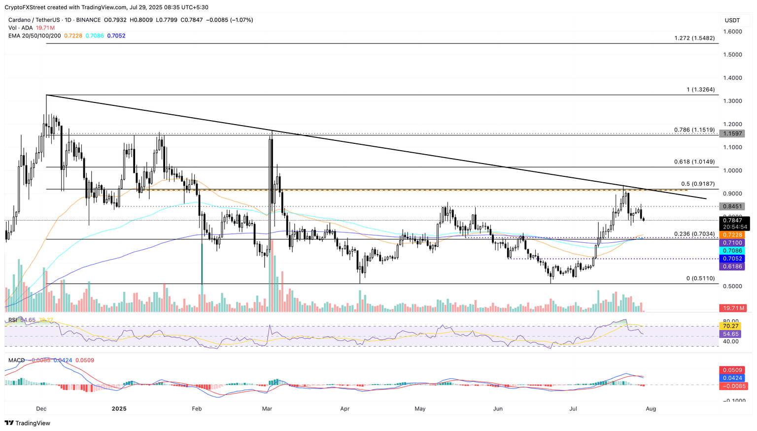 ADA’s recent rejection from the trendline on July 21 also marked the failure to surpass the 50% retracement level at $0.9187, drawn from $1.3264 on December 3 to $0.5110 on April 7. Cardano’s declining trend projects a path of least resistance to the 50-day EMA at $0.7228.