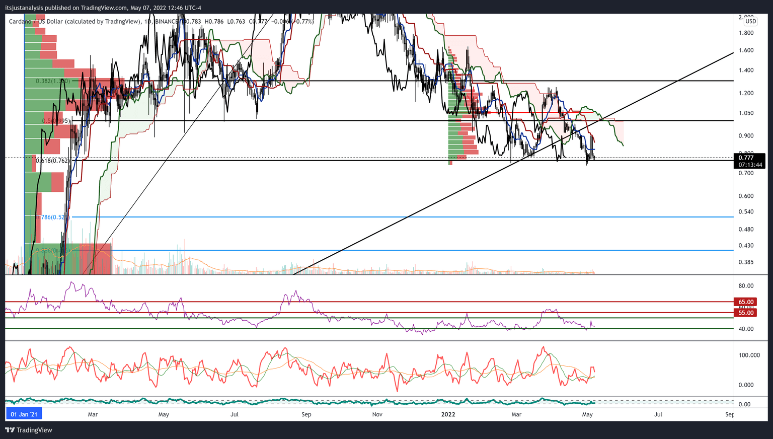 Cardano price is sitting right on top of its final, primary support structure. The $0.76 level represents the 61.8% Fibonacci retracement and the upper range of the current 2022 low. It is also the end of a high-volume node in the 2021 Volume Profile.