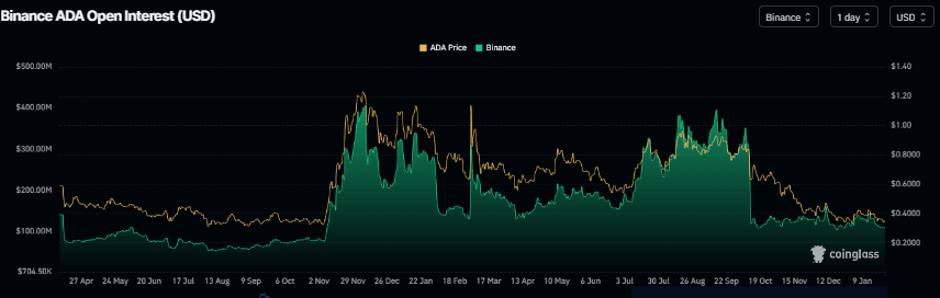 Cardano's futures Open Interest (OI) at Binance exchange dropped to $108.55 million on Sunday, the lowest level since December 25, according to Coinglass data. This drop in OI reflects waning investor participation and projects a bearish outlook.