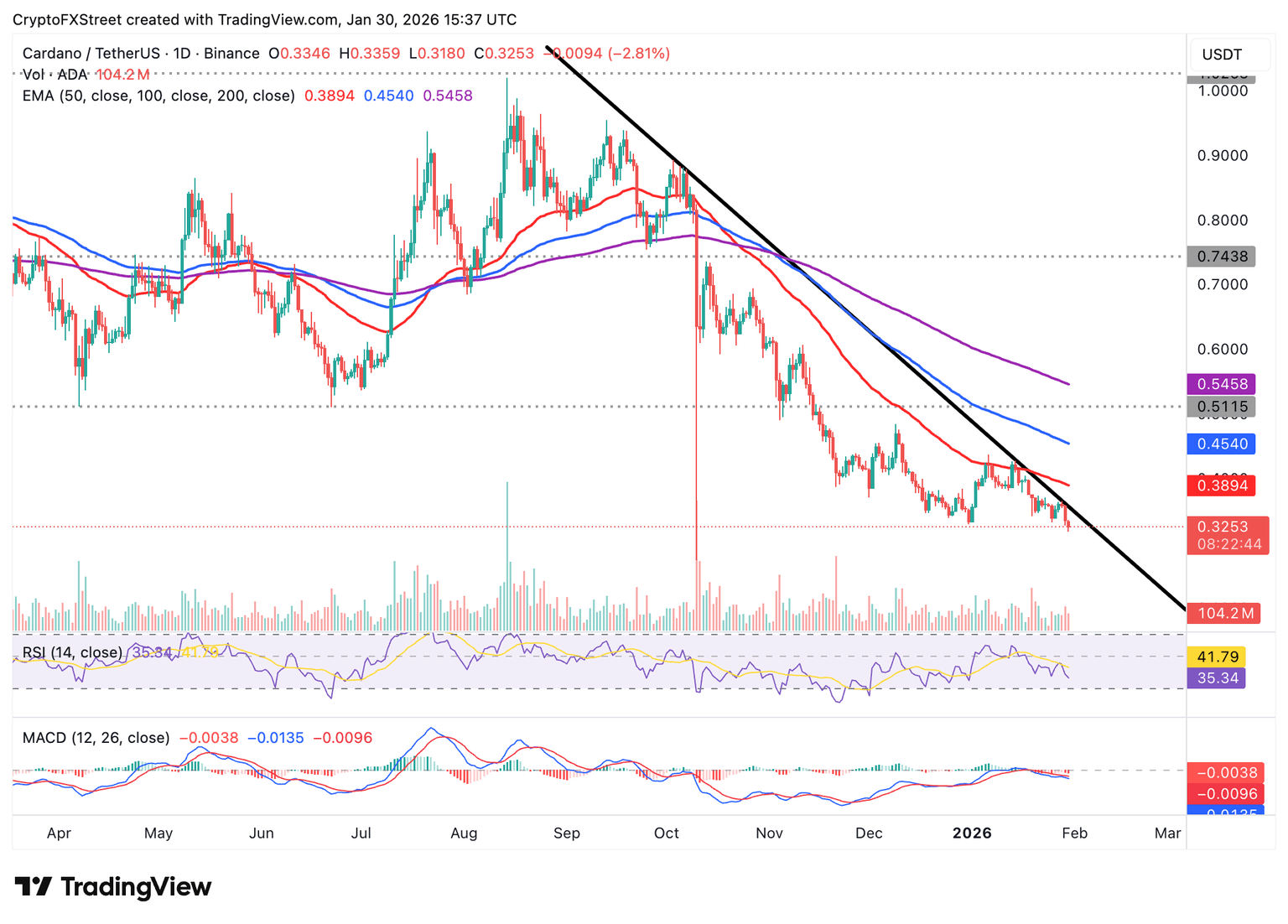 Cardano (ADA) is trading at $0.32 at the time of writing on Friday, down over 2% intraday, as bearish momentum continues to grip the broader crypto market. ADA has been caught in a broader drawdown that triggered cascading losses in risk assets, weighed down by persistent macroeconomic uncertainty.