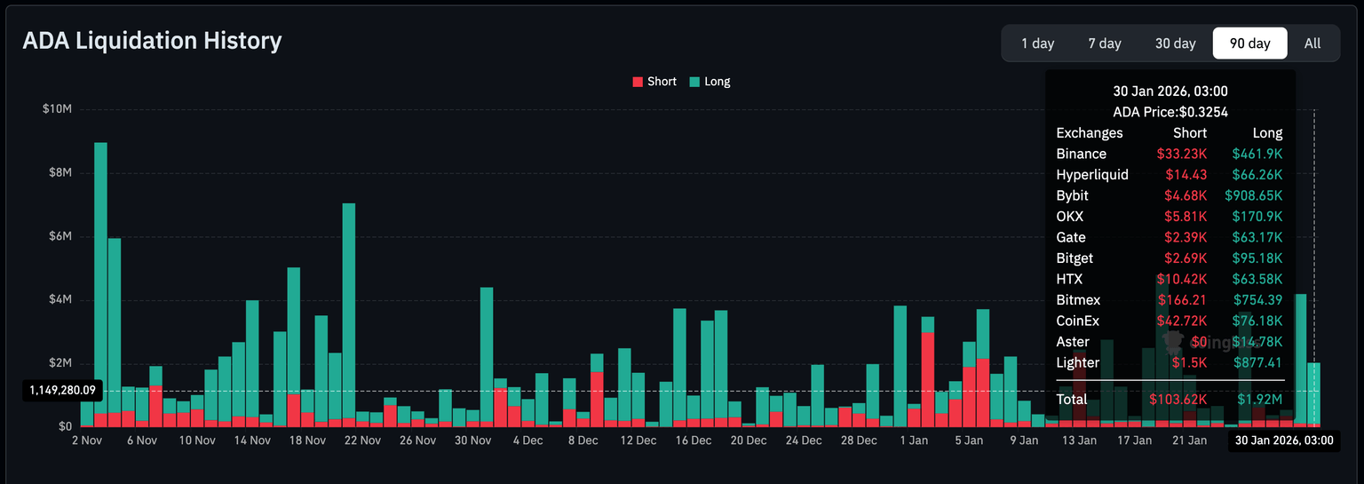 Cardano is down 11% from the week's open at $0.36 and 2% from the daily open at $0.33, reinforcing the overall bearish outlook. Leverage traders are counting losses, as long positions liquidated reached nearly $2 million on Friday, down from approximately $4 million on Thursday. The liquidation of long positions often fuels the downtrend.