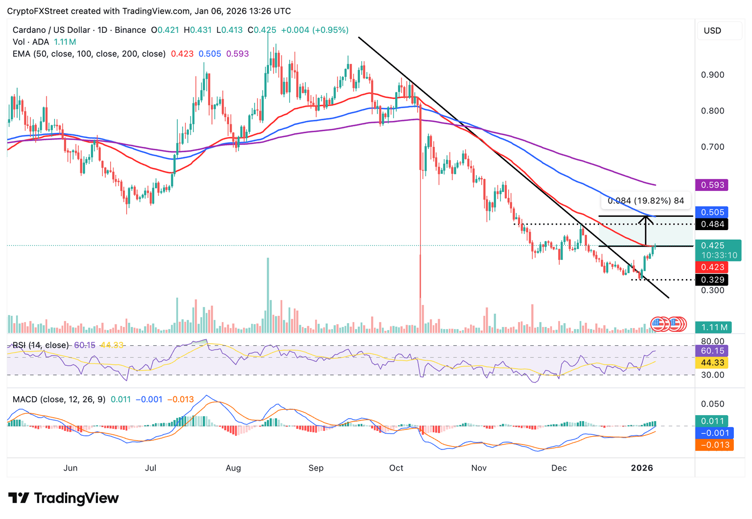 Cardano is trading above the 50-day Exponential Moving Average (EMA) at $0.423 on Tuesday. The token’s short-term outlook remains bullish, supported by the Moving Average Convergence Divergence (MACD) indicator, which has maintained a positive divergence above the signal line since December 28. The green histogram bars expanding above the mean line encourage traders to increase their risk exposure.