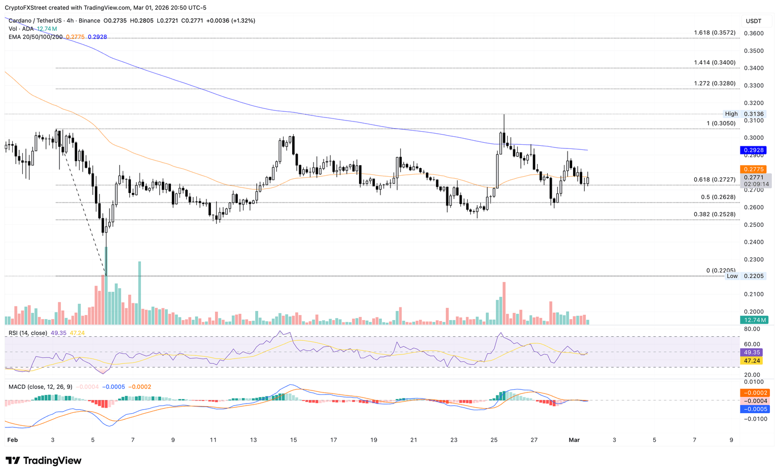 Cardano trades above $0.2770 at press time on Monday, testing the 50-period Exponential Moving Average (EMA) at $0.2775. However, the declining 50-period and 200-period EMAs keep the broader trend bearish.
