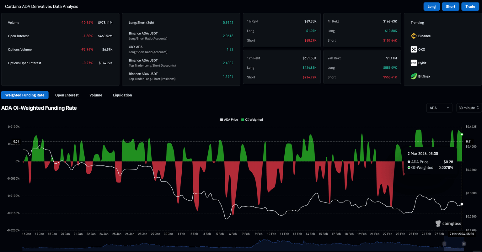 CoinGlass data shows the ADA futures Open Interest (OI) is down nearly 2% over the last 24 hours to $460.52 million, indicating a loss in positional buildup and a risk-averse condition. Consistent with this capital outflow, liquidations of $1.11 million over the last 24 hours, led by $559,090 in long liquidations and $553,410 in short liquidations, reflecting a nearly equal wipeout of either side.