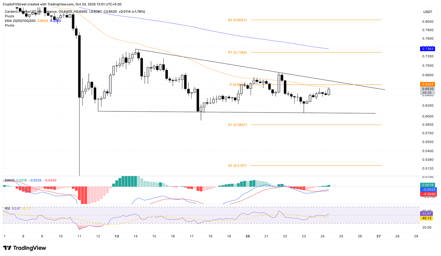 Cardano bounces off a local support trendline, which completes a descending triangle pattern on the 4-hour price chart. At the time of writing, ADA is facing resistance at the 50-period Exponential Moving Average (EMA) at $0.6554.
