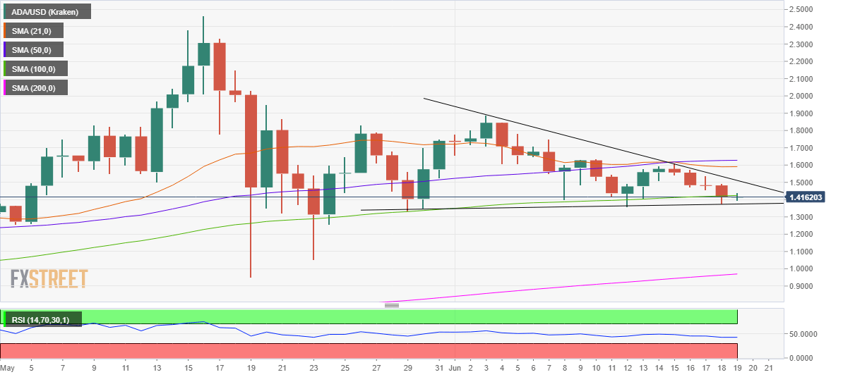 As observed on Cardano’s daily chart, the price has bounced off key support, although struggles to find a strong foothold above the 100-Daily Moving Average (DMA) at $1.4242.