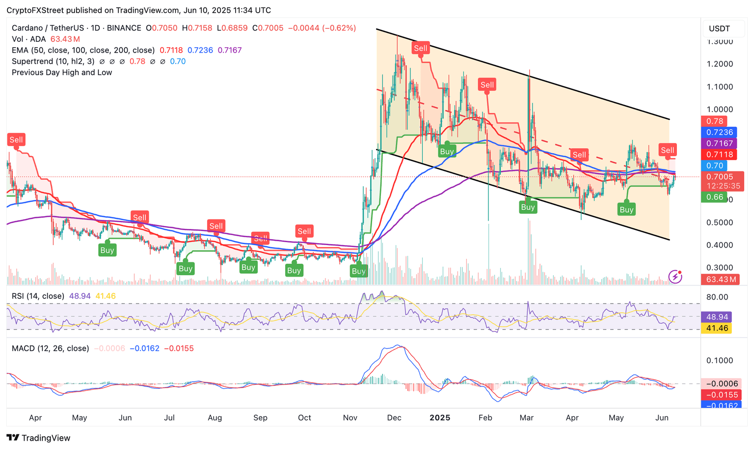 A buy signal occurs when the blue MACD line crosses above the red signal line, encouraging traders to seek exposure to ADA and anticipate an extended uptrend. Meanwhile, failure to break above the immediate confluence resistance at $0.71 could contribute to destabilizing the market, potentially leading to a pullback toward support levels at $0.62 and $0.50.