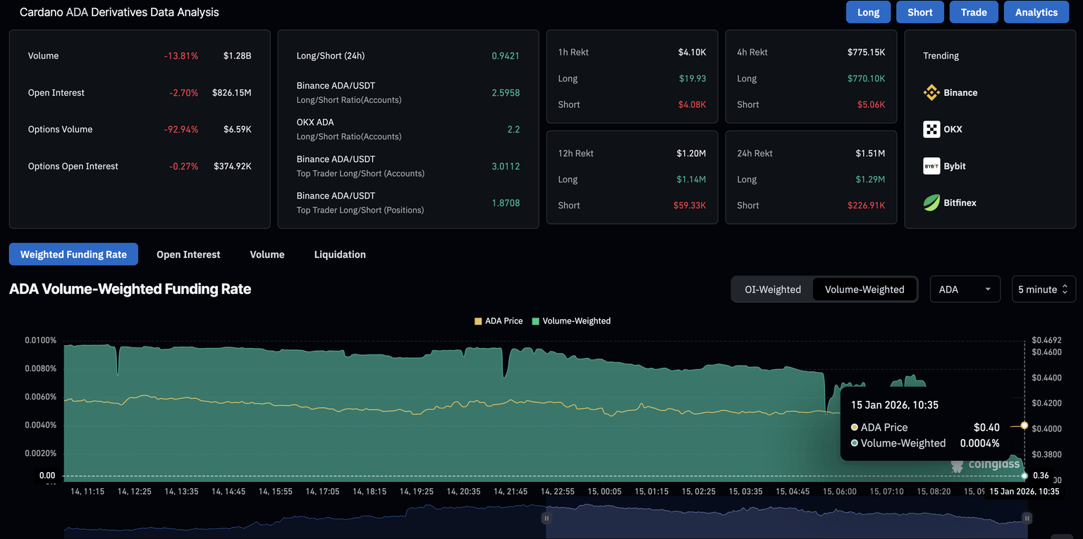 Cardano is losing retail interest amid a sudden shift to risk aversion in the broader cryptocurrency market, likely linked to the US Senate Banking Committee abruptly postponing its discussions on the digital asset market structure markup, initially scheduled for Thursday, until late January. CoinGlass data shows that ADA Open Interest (OI) is down 2.70% over the last 24 hours, to $826.15 million, signaling capital outflows and aligning with traders' lowered risk appetite.
