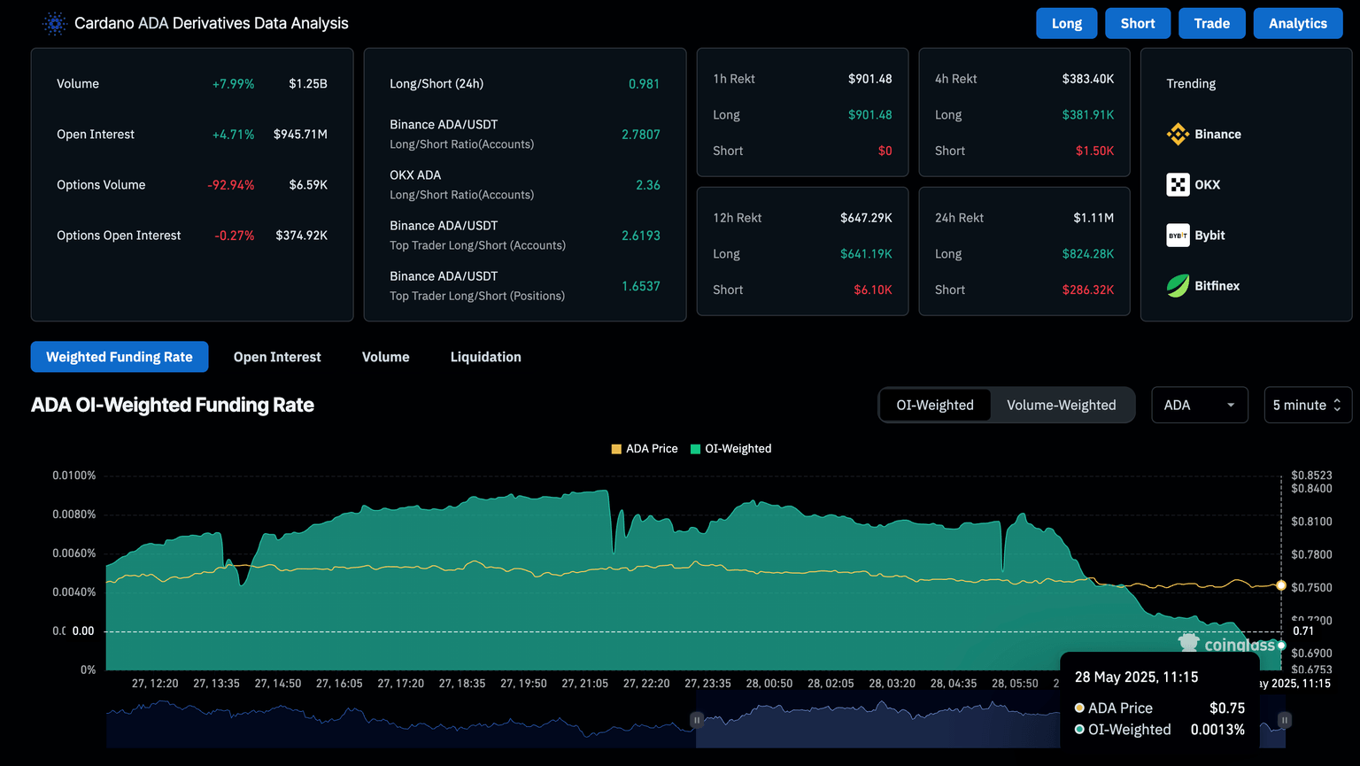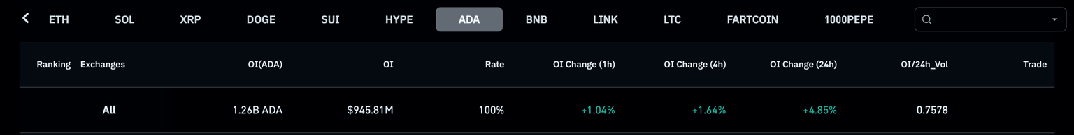 As Cardano hits a dire crossroads, ADA traders’ ambitions in the derivatives market face a huge impact. According to Coinglass, the ADA Open Interest (OI) has surged by over 4% to reach $945 million, indicating a capital inflow in Cardano derivatives.