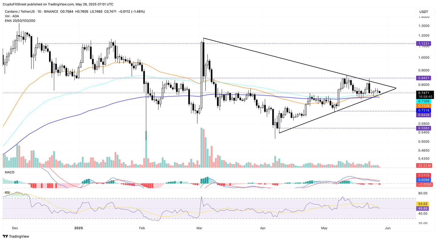 Cardano is up over 9% in May, with a volatile price action forming a triangle pattern on the daily chart. Lower highs on March 3, May 12, and May 23 form a declining trendline alongside the lows on April 9, May 6, and May 25, creating a support trendline that completes the triangle pattern. The ADA approaches the apex of the pattern with growing consolidation, hinting at a quick conclusion.