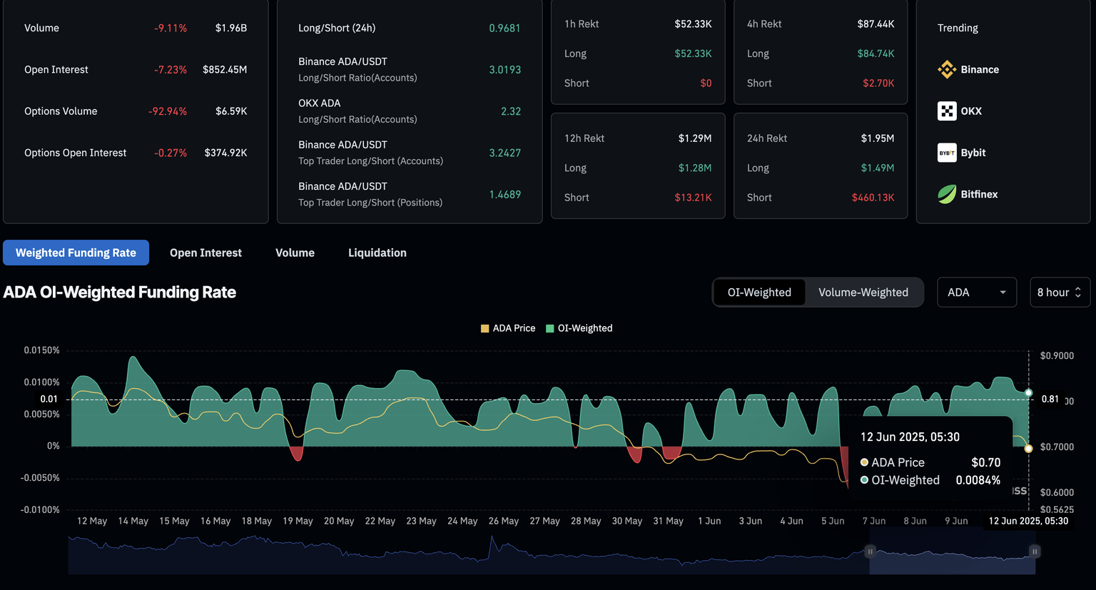 - A steep fall in ADA Open Interest reveals fading optimism in Cardano’s derivatives market.