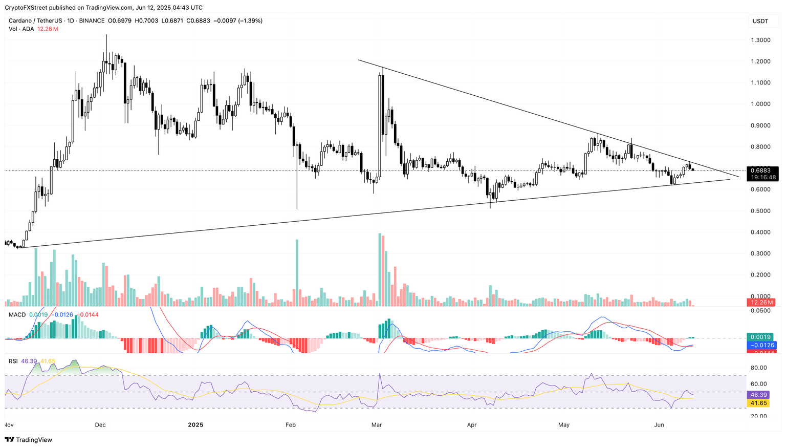 - Cardano faces rejection from a key resistance trendline, nearing the apex of a triangle pattern.