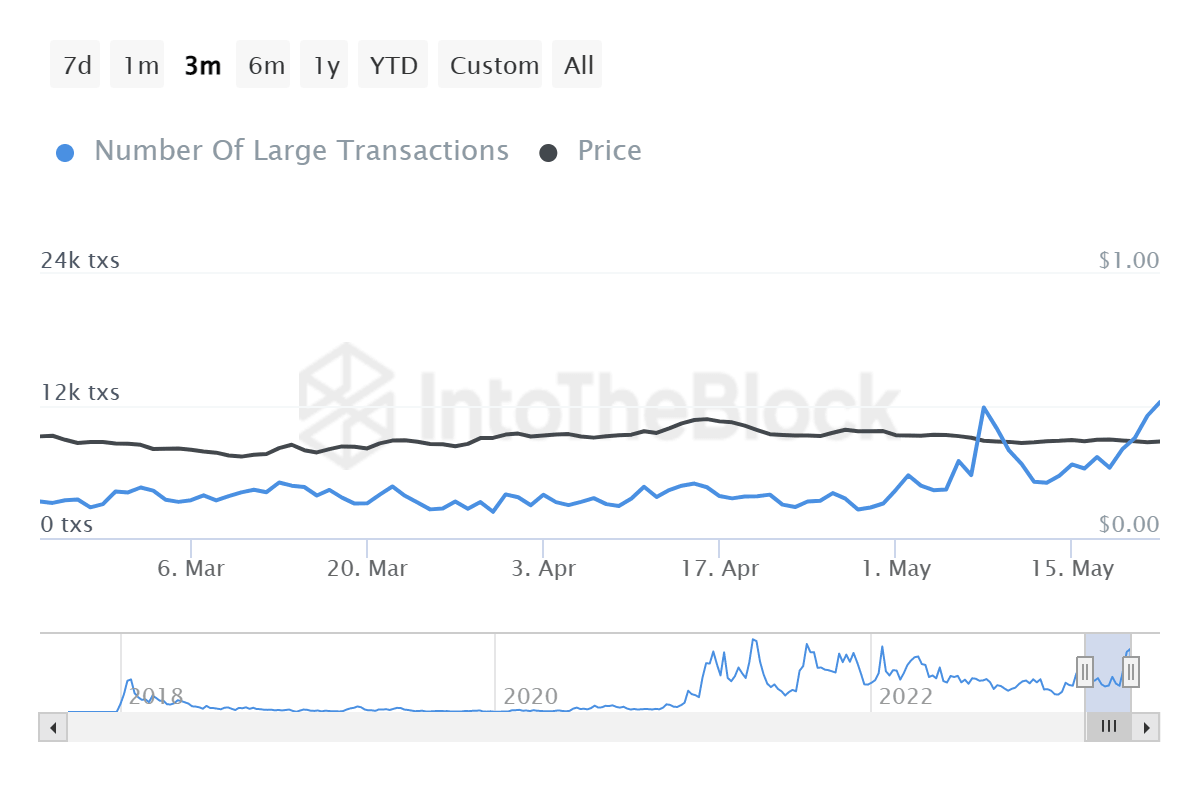 IntoTheBlock's large transactions metric determines the daily number of transactions exceeding $100,000, with the above chart showing that the last time Cardano recorded such an enormous whale activity was around May 2021.