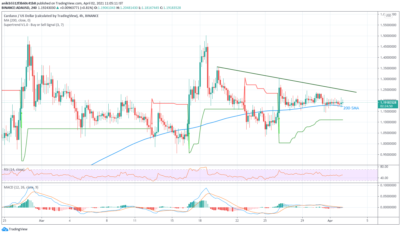 - ADA/USD holds gains above 200-SMA despite recently choppy moves.