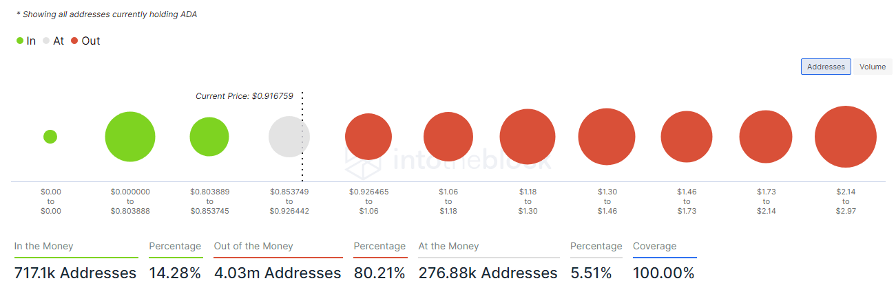 Cardano price action, when interpreted from an on-chain perspective, is equal to more bearish than it is on a Japanese candlesticks chart. The In & Out of the Money data set shows how badly Cardano hodlers are in the loss category.