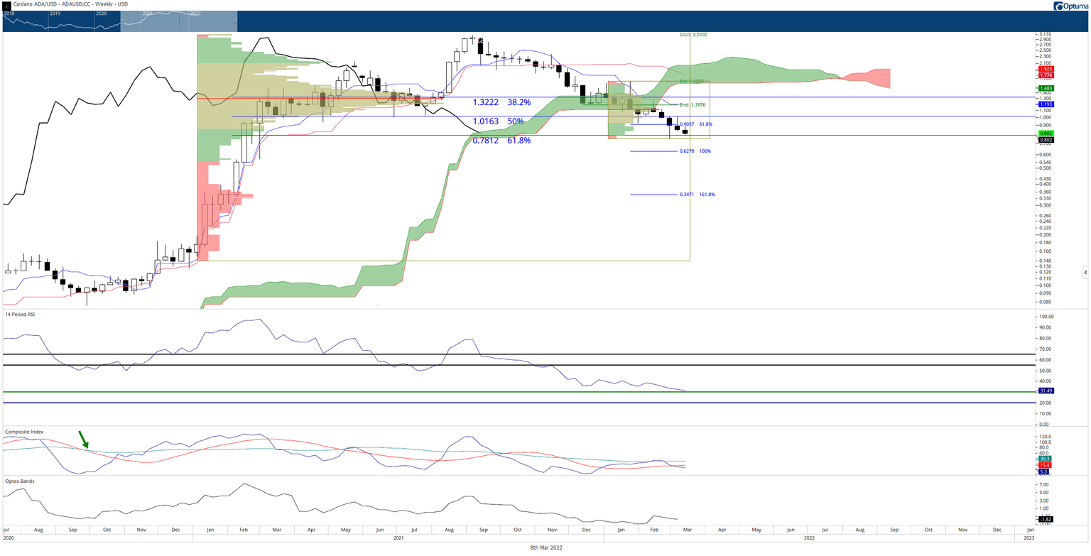 Near-term support for Cardano price is the 61.8% Fibonacci retracement at $0.78. Additionally, the Chikou Span is also reacting to the top of the Ichimoku Cloud as a support zone.