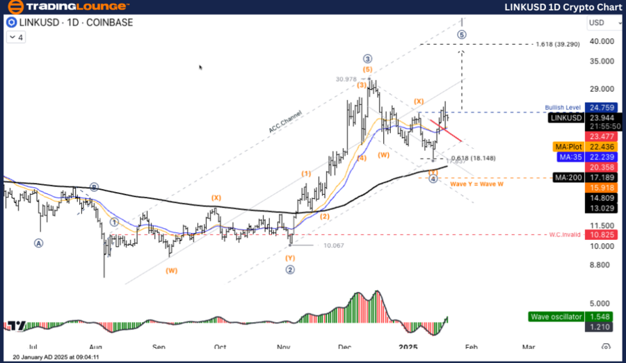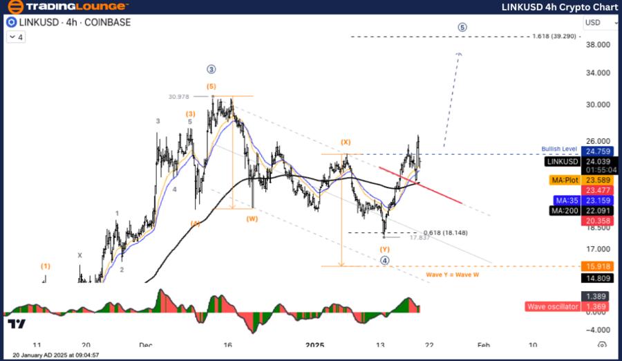 Link/ U.S. dollar (LINK/USD) Trading Strategy: Wave (4) ended at 17.837 (61.8% Fibonacci level) with a bounce to Wave (5). Positive Oscillator: Indicates strong uptrend momentum. Wave (5) 1.618 Fibonacci Extension level target is around 39.290.
