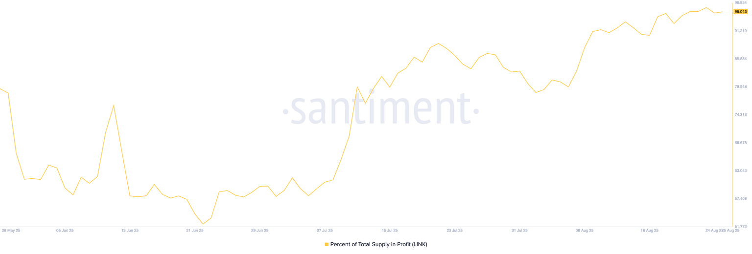 Santiment data shows the supply of LINK token in profit (bought at a price lower than the current market value) is at 95.04%, up from 80.57% on August 1. Typically, elevated levels of supply in profit indicate increased investor confidence and an uptrend in motion.