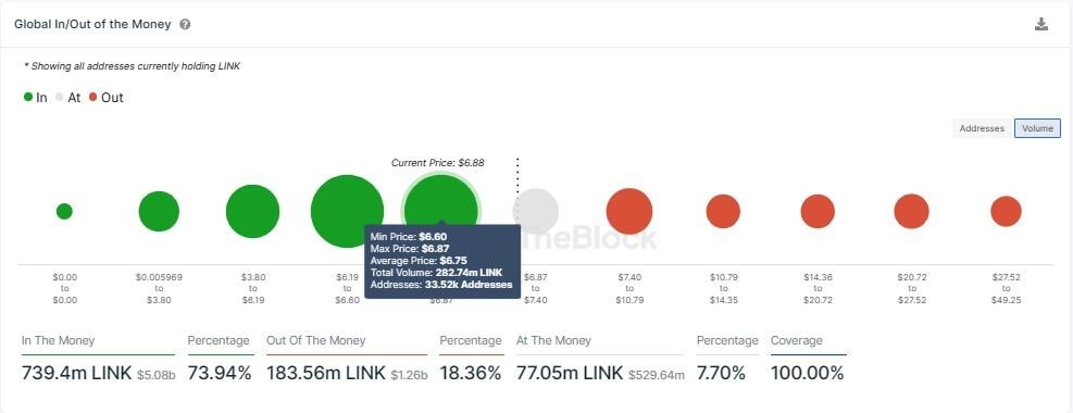 Data from blockchain analytics platform IntoTheBlock for the Global In/Out of the Money (GIOM) metric shows that Chainlink price has more robust support downward. With this, any efforts to send LINK down would be countered by buying pressure from 33,520 addresses that bought approximately 282.74 million LINK tokens at an average price of $6.75.