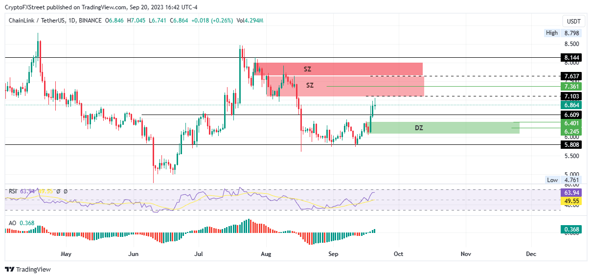 Chainlink price is facing a make-or-break moment after a rejection from the supply zone at $7.103.It has climbed 20% on the back of the cross-chain interoperability protocol (CCIP), a single interface that enables entrepreneurs in the Web3 and dApp spaces to solve problems. Chainlink executive Sergey Nazarov recently touted the concept, presenting the LINK ecosystem and its role in the future of capital markets.