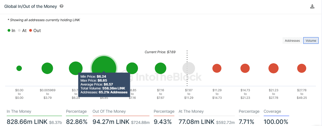 Data from IntoTheBlock’s Global In/Out of the Money (GIOM) supports the bullish outlook, showing Chainlink price had strong support at around the $6.24 to $6.65 range. Any efforts by the bears to push LINK south would be countered by buying pressure, from around 65,210 addresses that bought approximately 558.36 million LINK tokens at an average price of $6.57.