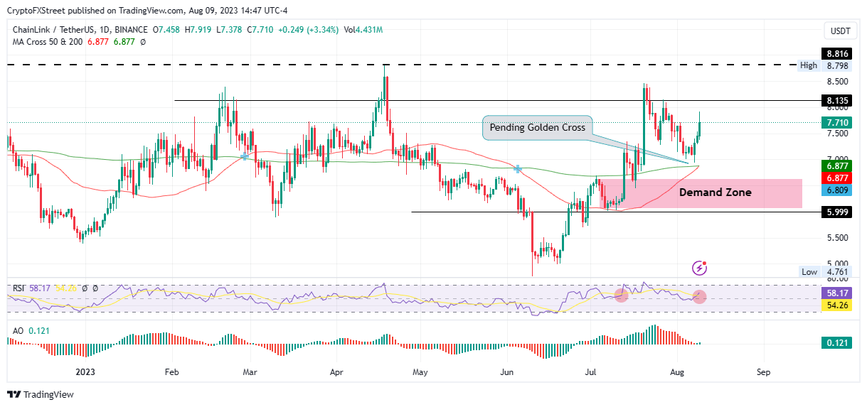 - LINK could rise 15% to breach the $8.816 resistance level if the 50-day MA and 200-day MA execute the pending golden cross.