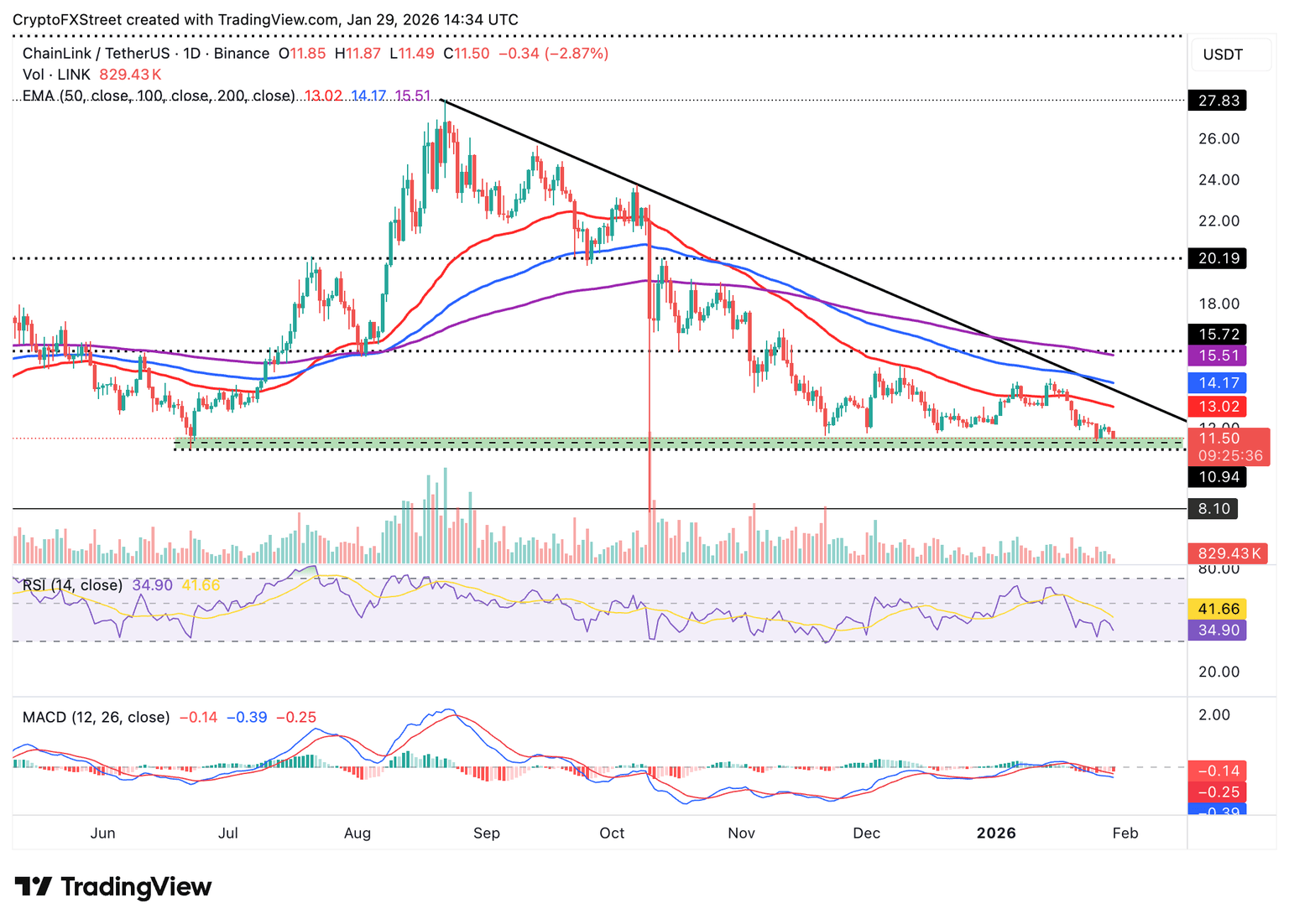 Chainlink (LINK) is trading at $11.16 at the time of writing on Thursday, extending its downtrend for the second consecutive day amid broader crypto market weakness.