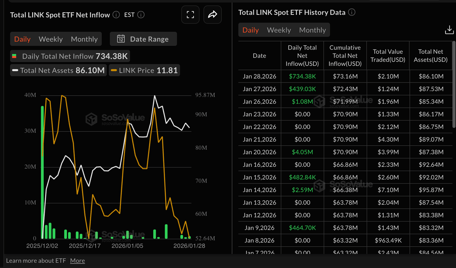 - LINK spot ETFs attract over $73 million in total inflows after pulling in $734,000 on Wednesday.
