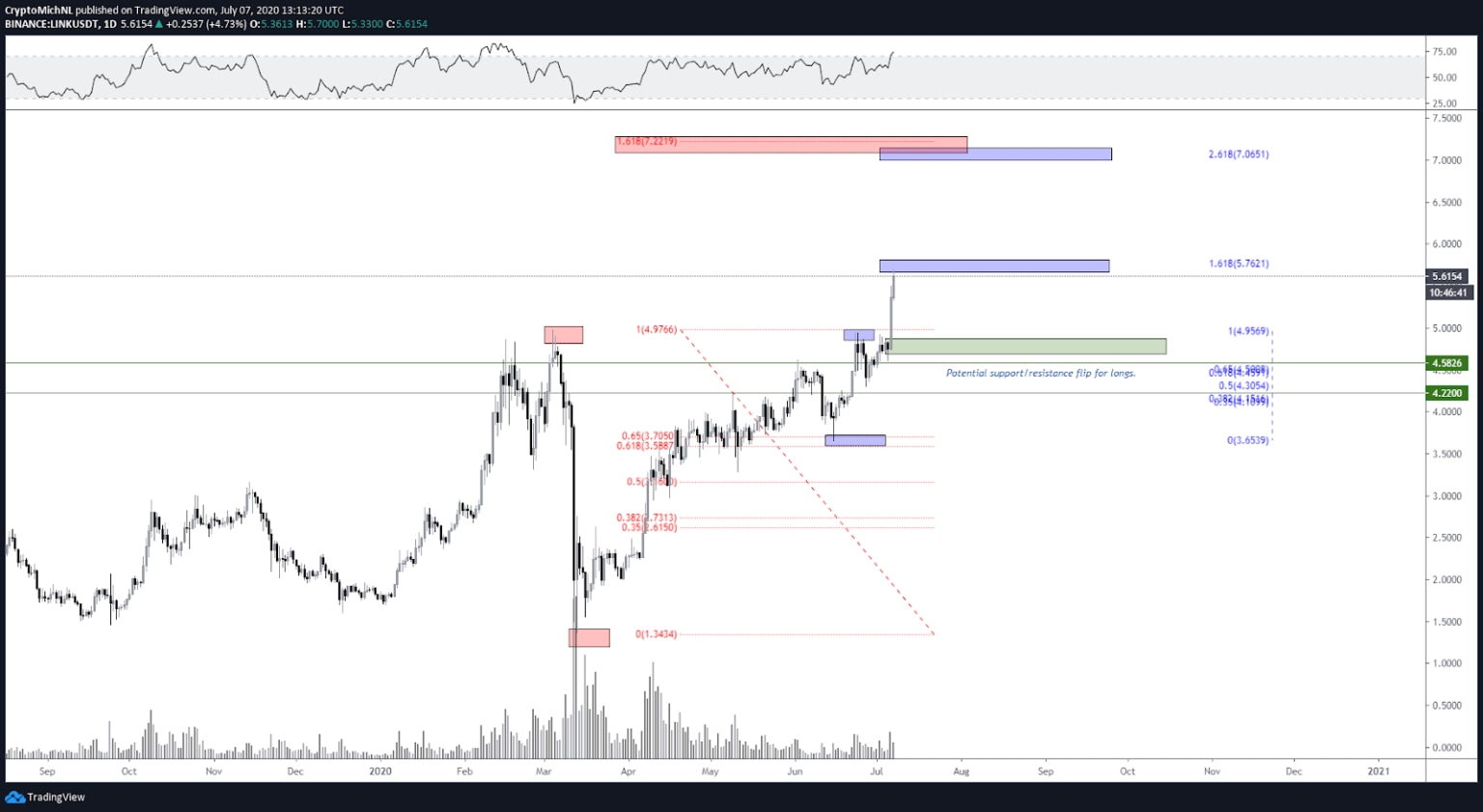 The new high of $5.70 is a new all-time high for Chainlink, which means that Chainlink is in a new price discovery phase and Fibonacci can be a useful tool for assets in price discovery.