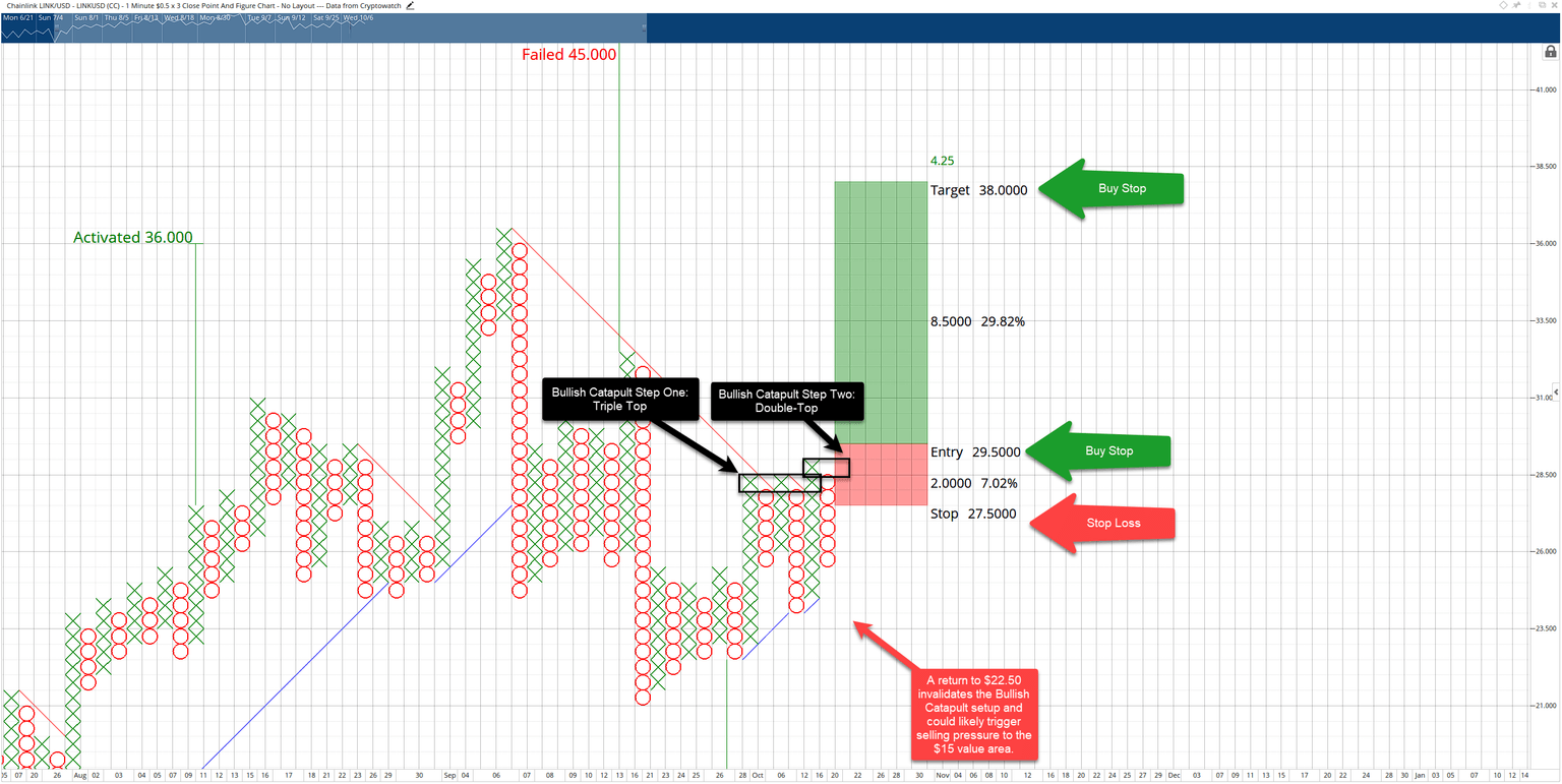 A Bullish Catapult pattern forms off of a triple-top and then a following double-top pattern. The Bullish Catapult is so sought after because of the nature in which it traps short sellers. The theory is that the initial spike following the entry is generated mainly by a short squeeze and other trapped shorts. For Chainlink price, the entry is at $29.50. The vertical profit target method in Point and Figure analysis identifies $38 as the target following the breakout.