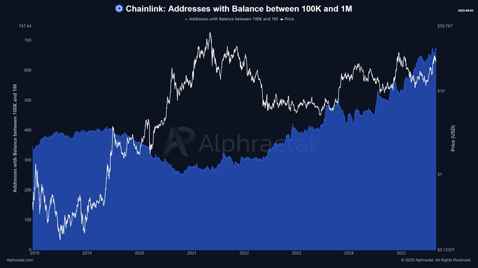 On-chain data from Alphractal reveals that wallets holding between 100,000 and 1 million LINK and those holding over 1 million LINK have steadily increased. The total has surpassed 600 wallets, setting a new all-time high (ATH) this month.