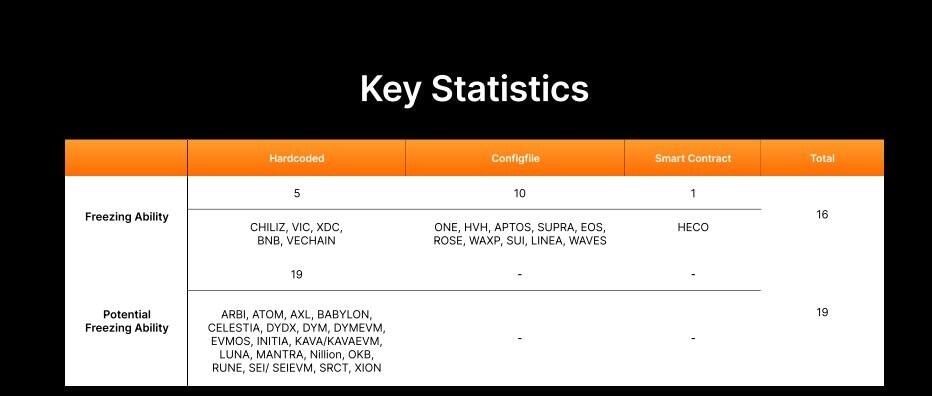 According to Bybit’s Lazarus Security Lab, a report has been released showing that, after reviewing 166 blockchain networks, 16 blockchains were found to have built-in fund-freezing capabilities. At the same time, another 19 could enable such features with minor protocol changes. The freezing mechanisms include hardcoded logic (e.g., CHZ and VeChain blockchains), configuration file controls (Sui and Aptos), and on-chain contract execution (HECO), as shown in the graph below.