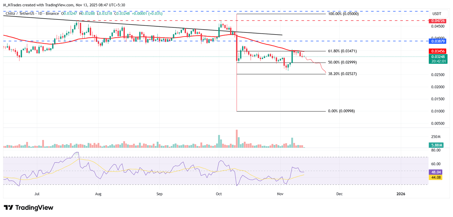 Chiliz price faced rejection around the 50-day Exponential Moving Average (EMA) at $0.034 on Saturday and declined 5% by Wednesday. This level coincides with the 61.8% Fibonacci retracement level at $0.034, making this a key resistance zone. At the time of writing on Thursday, CHZ hovers at around $0.032.
