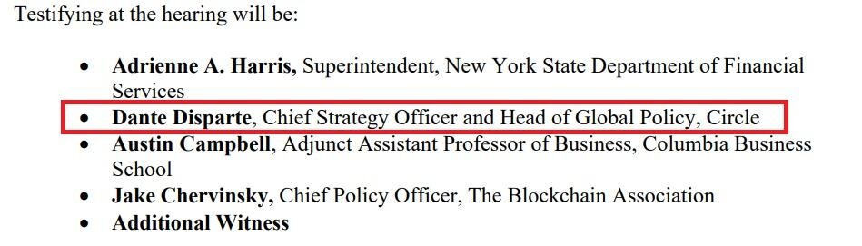 Participants testifying at the hearing include Circle’s chief strategy officer and head of global policy, Dante Disparte. Last month, on March 11, Circle’s in-house stablecoin offering, USD Coin, depegged from the U.S. dollar after it revealed it had $3.3 billion of funds stuck at the collapsed Silicon Valley Bank (SVB).