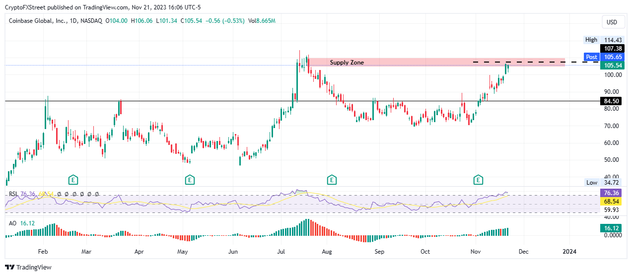 Coinbase (COIN) shares have climbed at least 5% on the news of the Binance exchange saga, testing the supply zone extending from $105.31 to $110.01. At the time of writing, COIN is trading for $105.54.