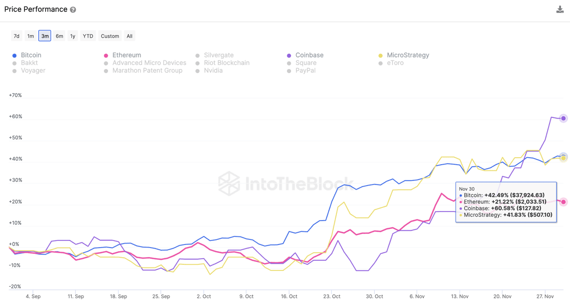 Price performance: COIN, BTC, ETH, MicroStrategy