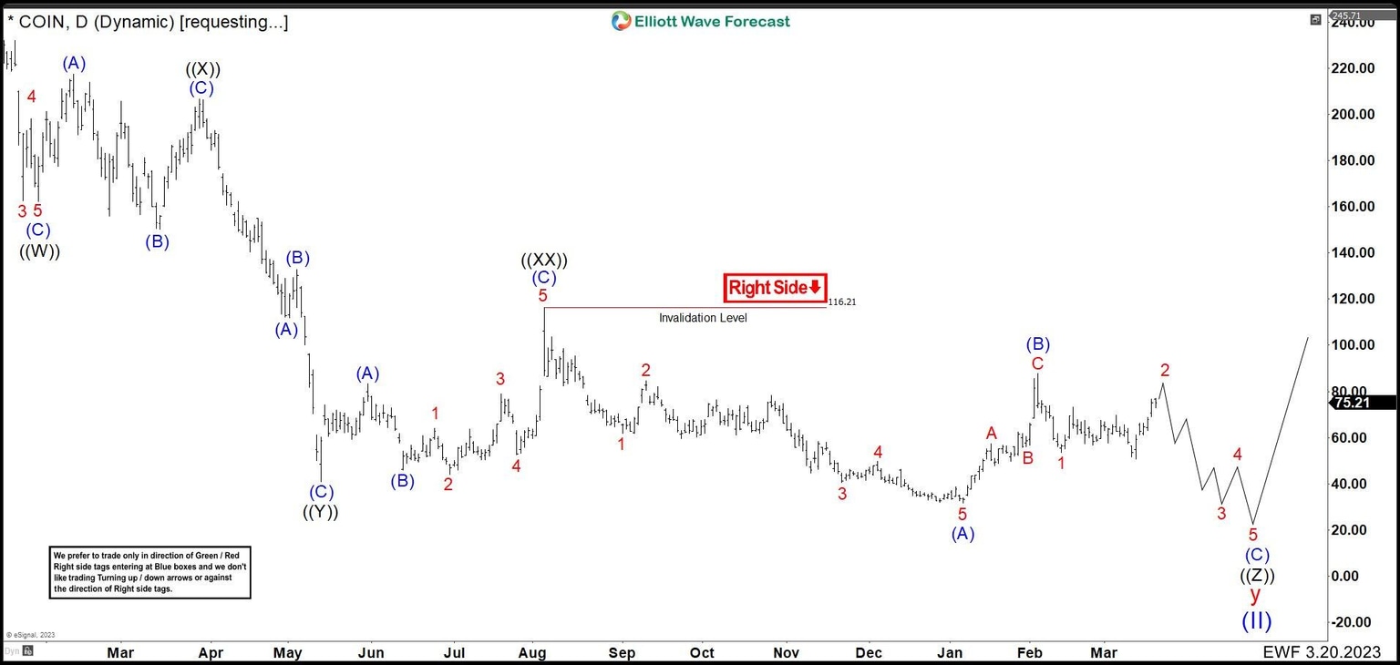 A few months later, COIN did not have the strength to break $31.55 low and after a correction rally again. Therefore, the wave (B) had another structure. The wave A of (B) ended at $87.88. Then, we can see 3 swings lower as a flat correction to end wave B of (B) at $46.43. To complete the wave (B) structure, the market bounced to $114.43 before turning lower again. As price action did not broke the invalidation level at $116.30, we are still calling for more downside, as an impulse structure, to end the triple correction in $29.95 – $9.92 area.