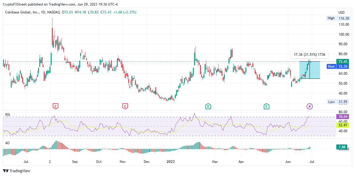 Data from Nasdaq shows that Coinbase (COIN) stocks are up 2.37% in the last 24 hours, and a whopping 30% in the last week.