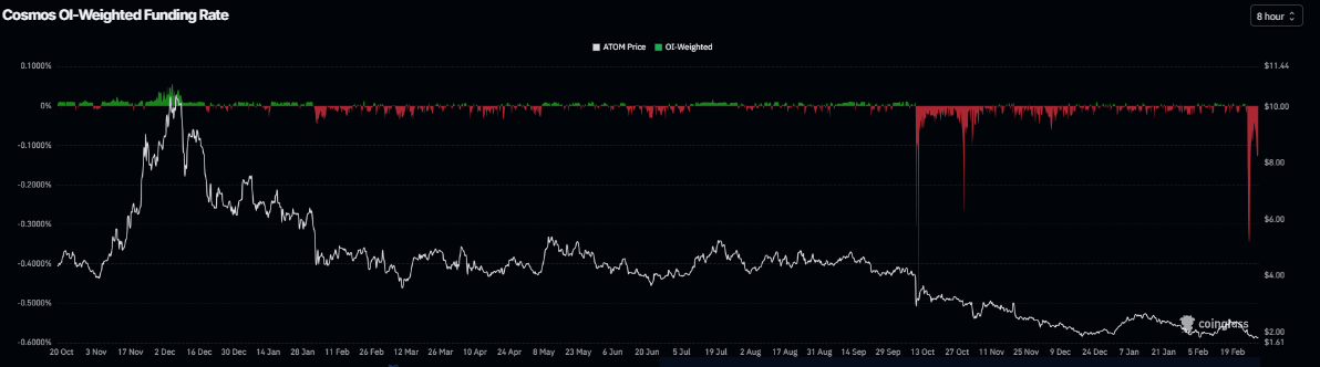 Derivatives data for Cosmos Hub also support a bearish outlook. Coinglass’s OI-Weighted Funding Rate data shows that the number of traders betting that the price of ATOM will slide further is higher than those anticipating a price increase. The metric flipped to a negative rate on Thursday and stands at -0.127% on Monday, indicating shorts are paying longs and suggesting bearish sentiment toward ATOM.