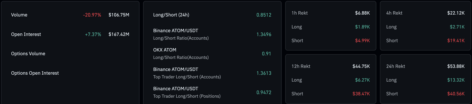 On the derivatives side, CoinGlass data shows ATOM futures Open Interest (OI) is up 7.37% over the last 24 hours, to $167.42 million, indicating a capital influx consistent with renewed on-chain demand. A steady rise in chain value and OI could shift the bias upside for ATOM.