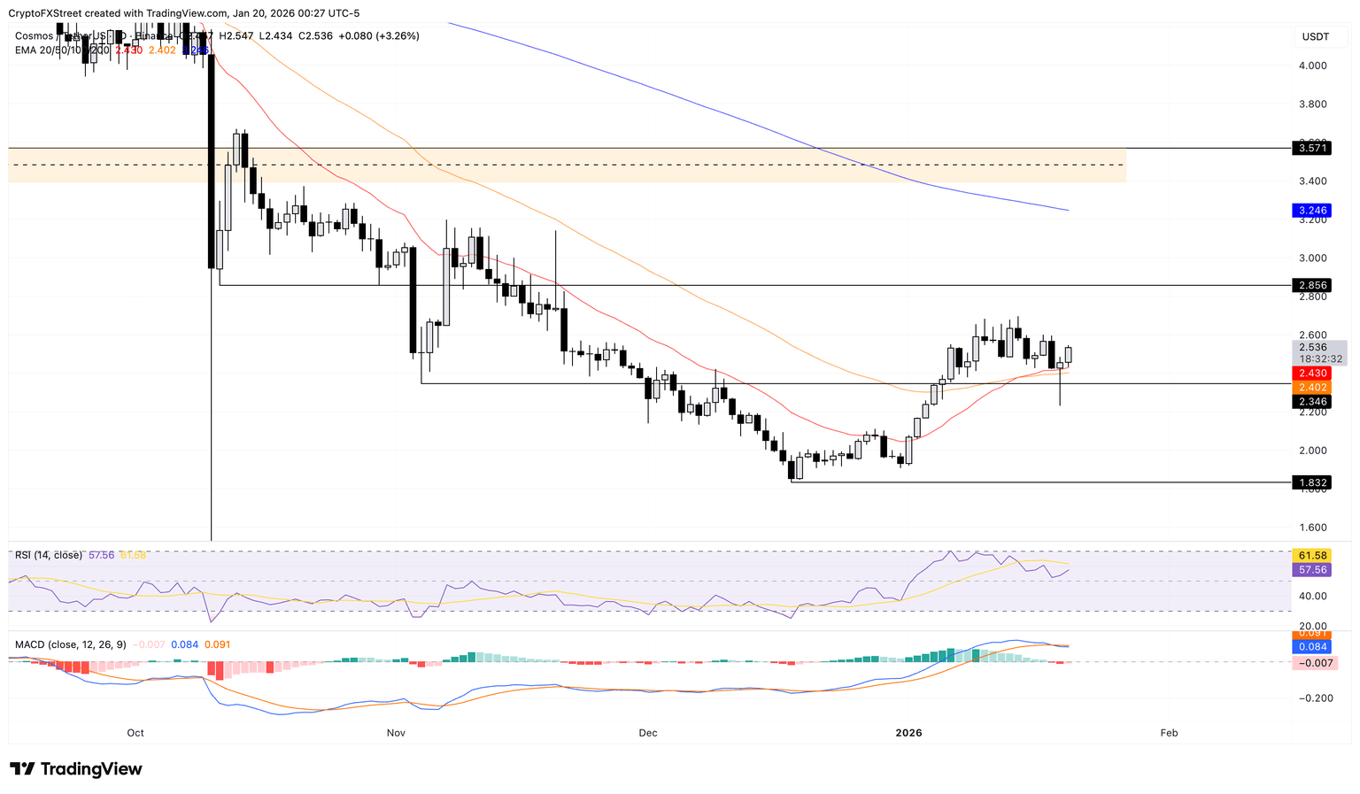 Cosmos holds above the 20-day EMA at $2.43 and the 50-day EMA at $2.40, with both averages edging higher and supporting the short-term bid. Still, ATOM remains well beneath a falling 200-day EMA at $3.24, reflecting a broader downtrend.