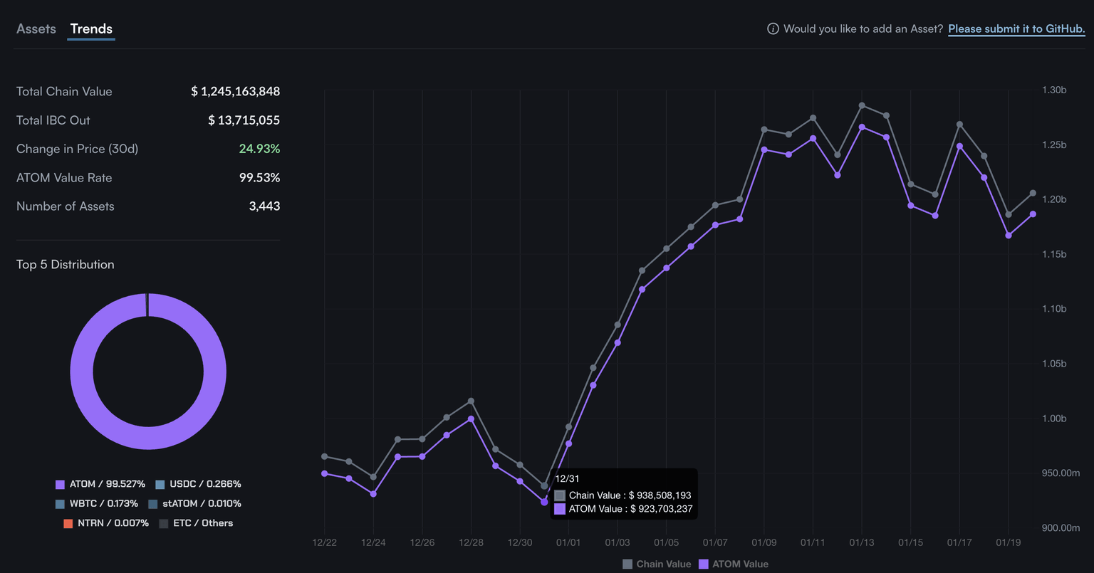 According to Mintscan data, the Total Chain Value of Cosmos stands at $1.24 billion on Monday, up from $938.50 million on December 31. Over 99% of the value is derived from ATOM, while Inter-Blockchain Communication (IBC) accounts for $13.71 million of outflow from the blockchain.