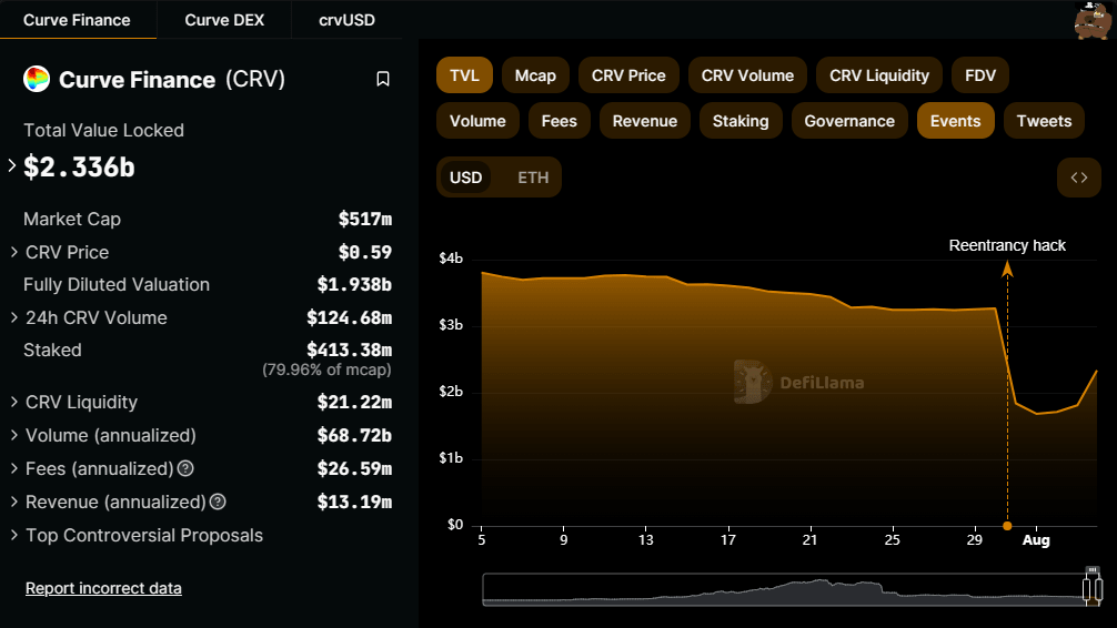 CRV TVL is up 48% to $2.33 billion after dropping 50% from $3.27 billion to $1.57 billion during the hack July 31 hack.