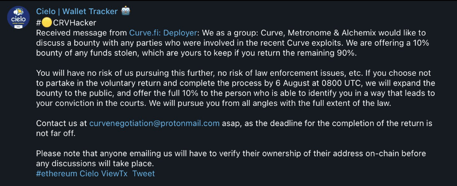To salvage the situation, the Curve team has agreed to a compromise, proposing a 10% bounty to the hacker to return the funds in exchange for no prosecution. The deal is only open until August 6 at 0800 UTC.