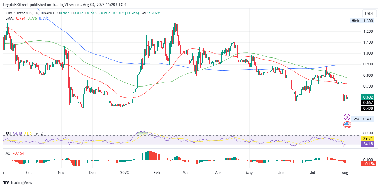 The Relative Strength Index (RSI) at 34 and the Awesome Oscillators (AO) histograms in the negative are concerning, suggesting bears have an advantage in the CRV market.