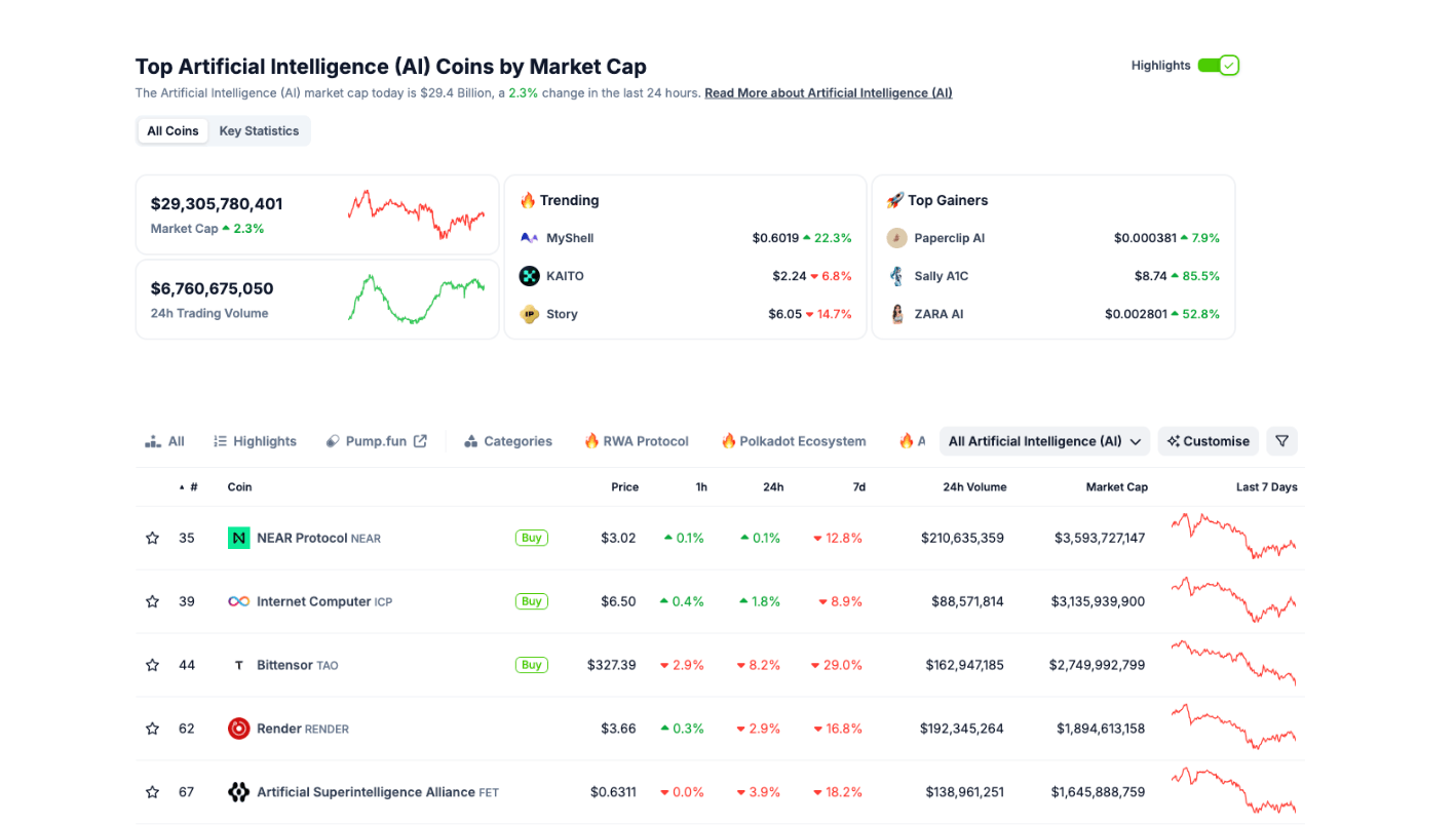 The AI sector’s total valuation climbed to $29.4 billion, underlining the market’s hunger for cutting-edge machine learning applications in blockchain environments.