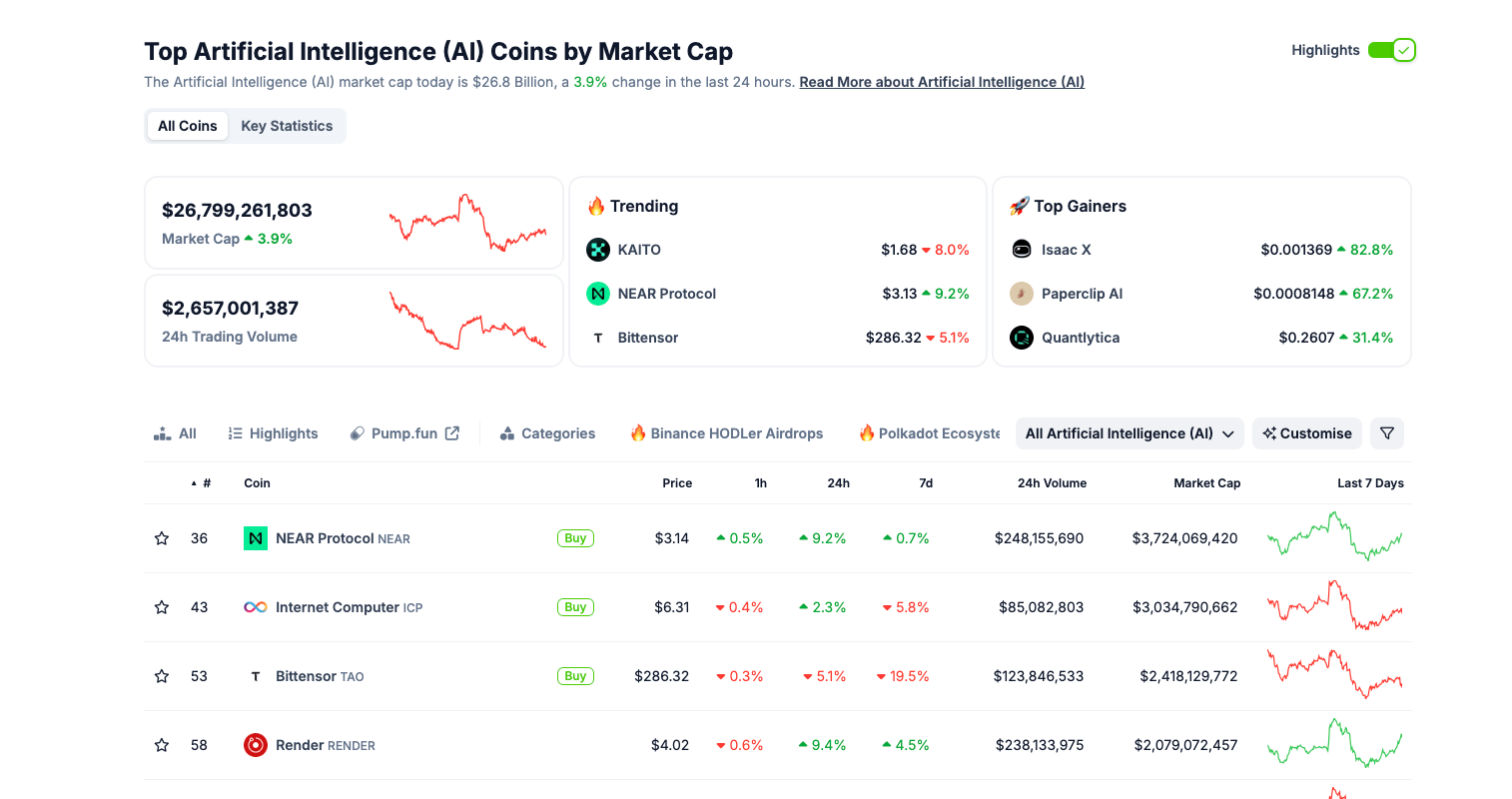 The cryptocurrency sector is experiencing notable momentum, with artificial intelligence (AI) tokens leading the charge. Within 24 hours, the market capitalization of AI-related cryptocurrencies has risen by 3.9% to $26.8 billion adding over $700 million and outpacing the global crypto market's 6.2% growth.