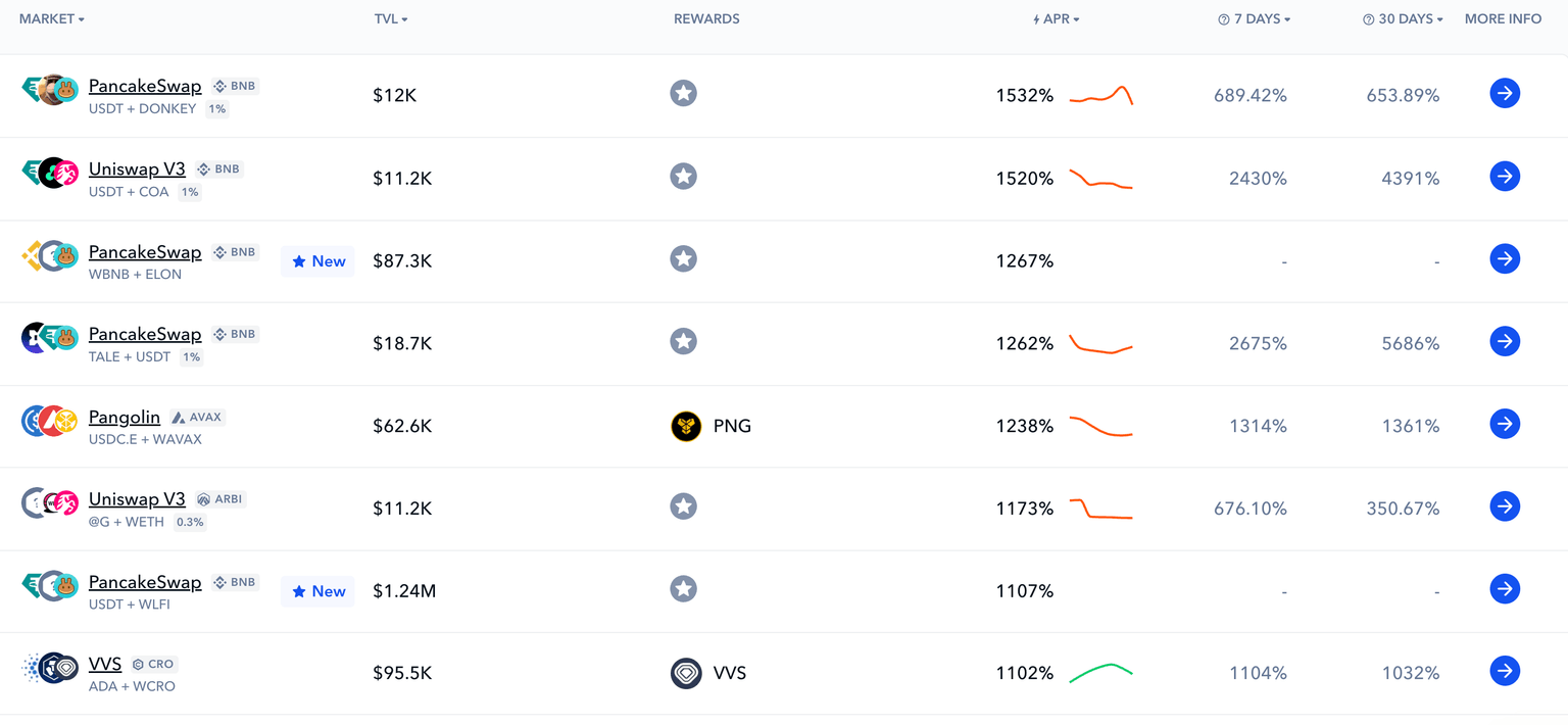 According to De.Fi, the multiple liquidity pools on Uniswap and PancakeSwap offer annual yields from 1,200% to 1,500%.