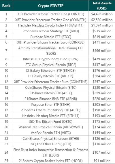 List of top 25 crypto ETFs and ETPs as of September 11